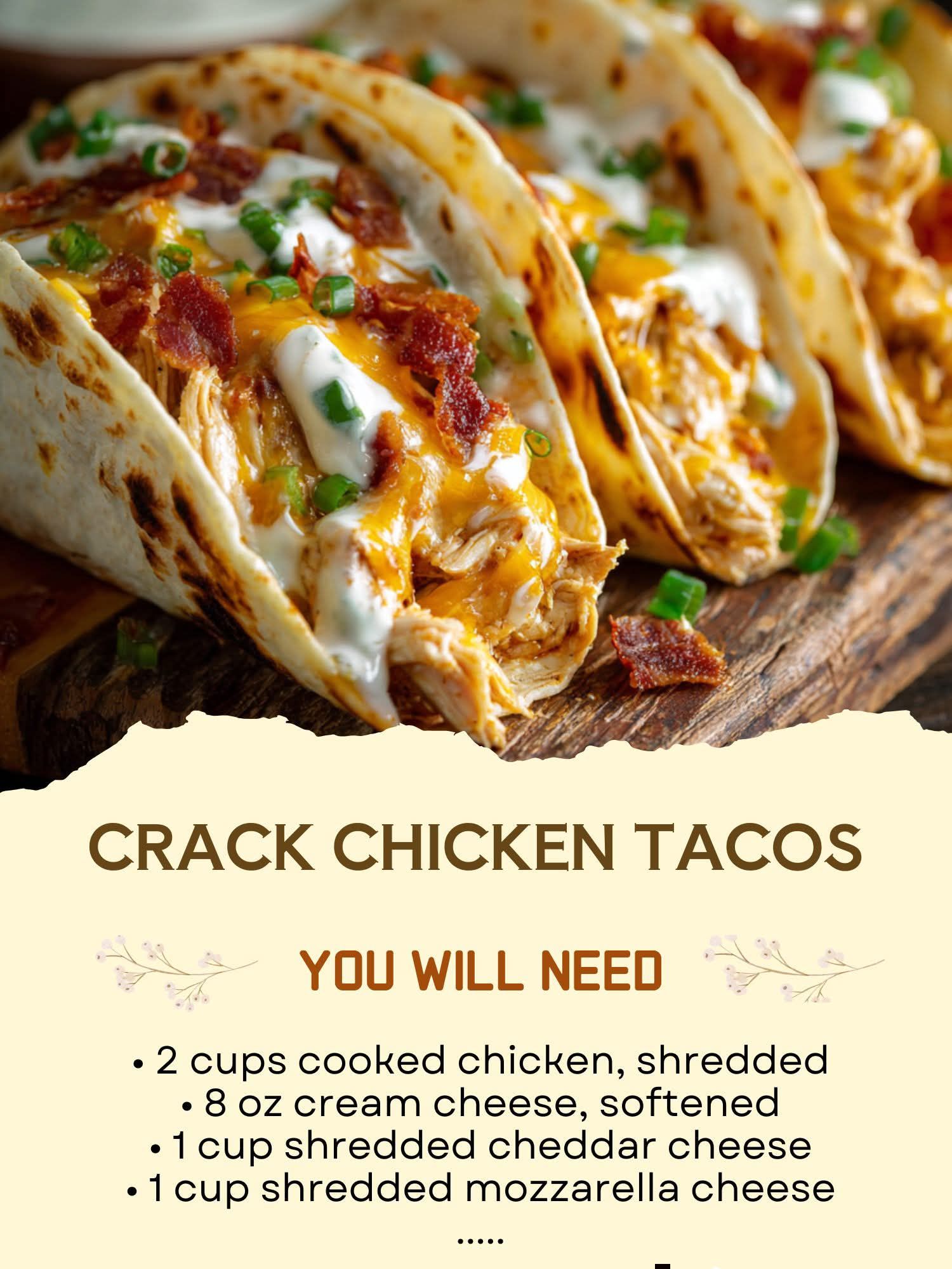 Spoon the crack chicken mixture into tortillas and add desired toppings.